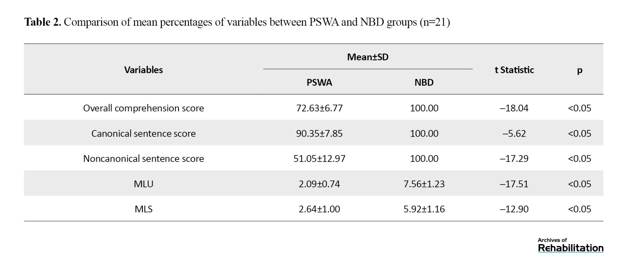 Between-group comparisons revealed that the NBD group performed flawlessly across all sentence comprehension variables, while the PSWA group performed significantly lower across all measures. Statistically significant differences were observed between the two groups for both comprehension and production indices, including overall comprehension scores, comprehension of canonical and noncanonical sentences, as well as MLU and MLS. Details of these differences are presented in Table 2.