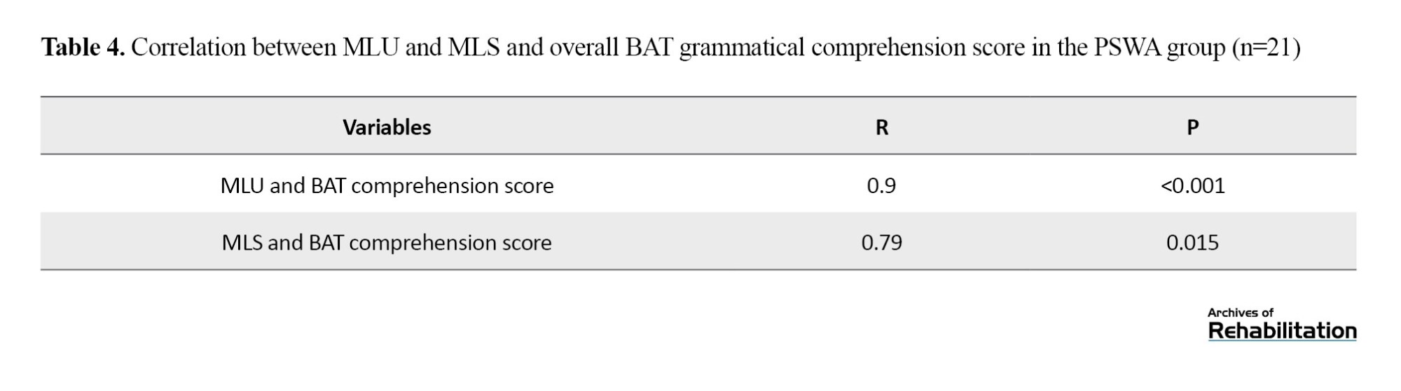This study was conducted to investigate the comprehension of canonical and noncanonical sentences, as well as its relationship with production measures—specifically, MLU and MLS—in PSWA. In line with this aim, four research objectives were defined, and the findings are discussed accordingly.