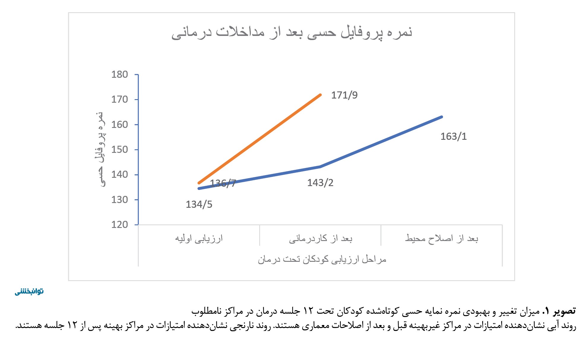 از طرفی میزان تغییرات نمره نمایه حسی کوتاهشده این مراکز پس از اصلاحات و به دنبال 21 جلسه درمانی، در مقایسه با مراکز مطلوب تفاوت معنیداری را نشان داده است (p=0/01) (